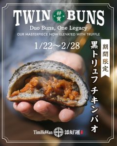 クラシックと革新を掛け合わせた冬限定の新商品「黒トリュフチキンバオ」を1 /22 日より期間限定で販売いたします!これを記念して1/19~1/25の期間中に本アカウントをフォロー&本投稿を「いいね!」していただいた方より抽選で20名様に国内の添好運(ティム・ホー・ワン)で使用できる2000円分のお食事券をプレゼント!この機会をお見逃しなく!!